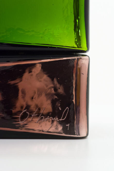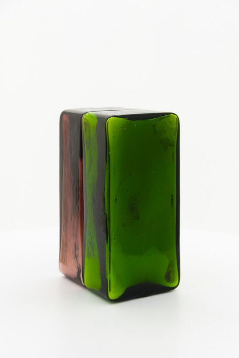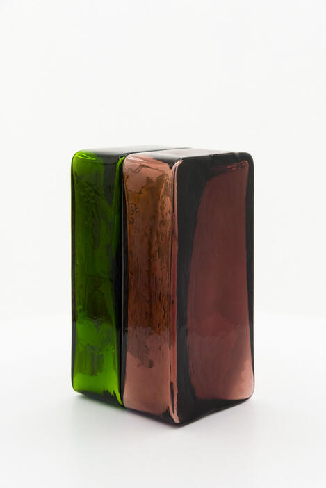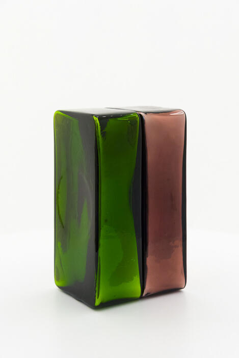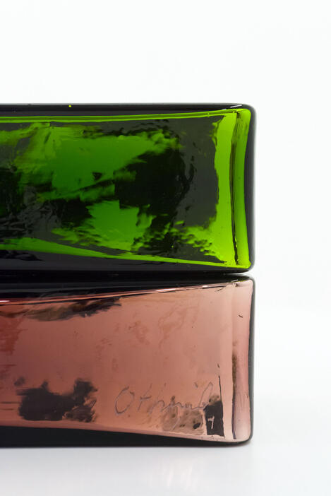 Known for his evocative glass sculptures, Othoniel has employed his signature medium to create a variable edition of 20 mirrored glass bricks. Each edition comprises two self-standing bricks in three distinct color pairings: green and purple, green and gold, and purple and gold.